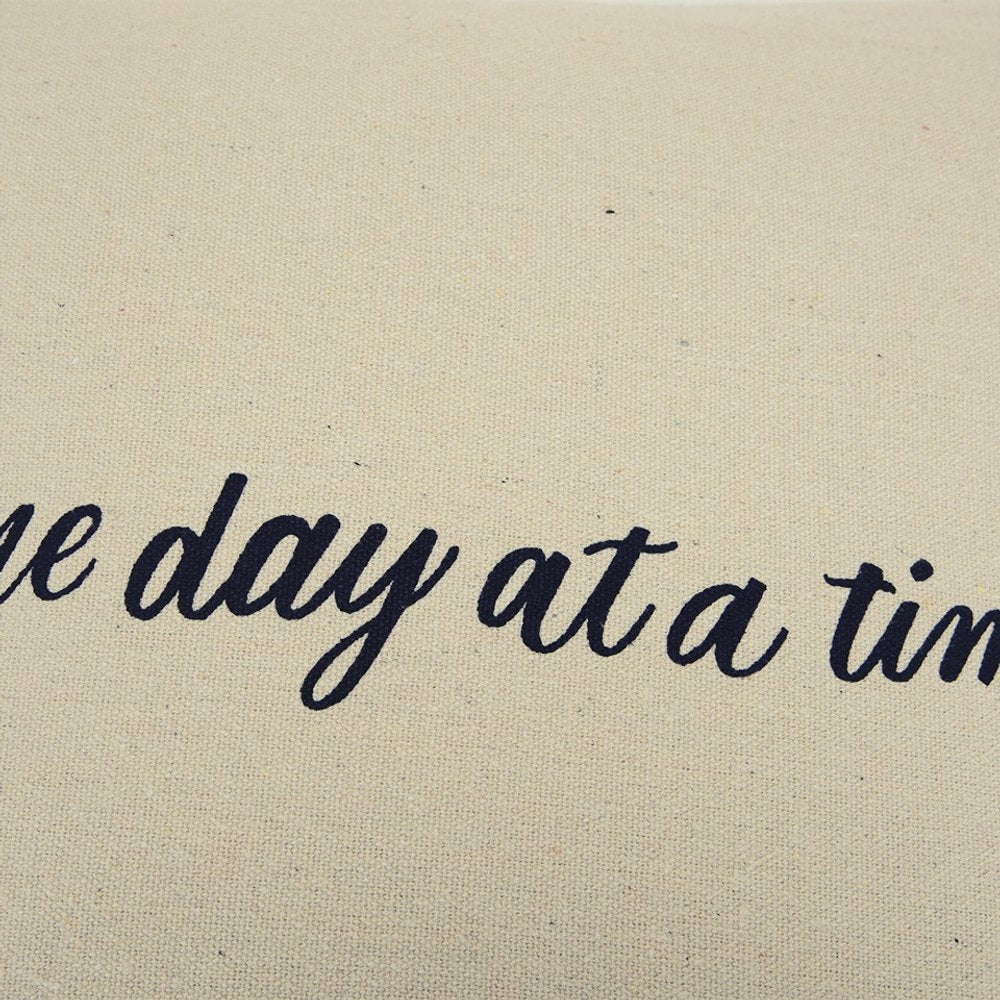 Bring a classic modern tone into your home with this Black Taupe Canvas One Day Throw Pillow that will cozy up your living space with a calming ambiance. The beautifully written cursive words that states ‘One day at a time’ in black over the taupe background create a modern appeal while encouraging us to live in the present rather than dwelling in the past or worrying about the future. Featuring a recycled cotton canvas base, the pillow is highly soft and durable to last for a long time and the knife edging is meant to give the pillow a clean and polished appearance. The pillow has a solid cotton back with a hidden zipper closure for convenience. Simple, subtle, and stylish, this decorative throw pillow will seamlessly blend in with a variety of interior styles and decors. 20” x 20” x 6.25”
