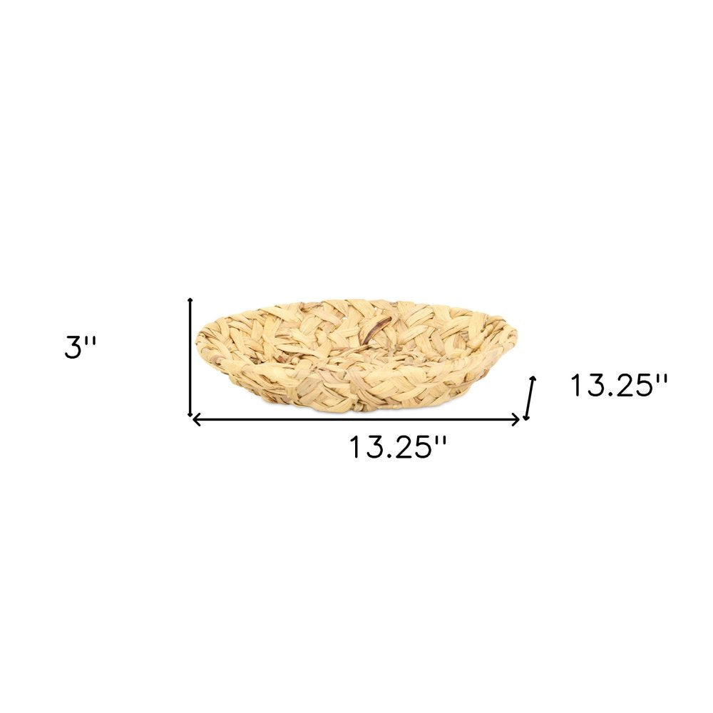 Add a touch of natural design to any space in your home with this Braided Water Hyacinth Decorative Bowl. This piece is made from strips of natural water hyacinth plant that are braided around a metal body. The bowl has a shallow look to it with a curved edge around in. This bowl can be used as a decorative bowl on your kitchen counter or coffee table or you can use it to hold your keys on the entry table or hold makeup and jewelry on any vanity table you might have. 3" H x 13.25" W x 13.25" D