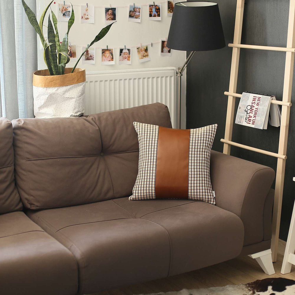 Brown Houndstooth Faux Leather Strap Throw Pillow