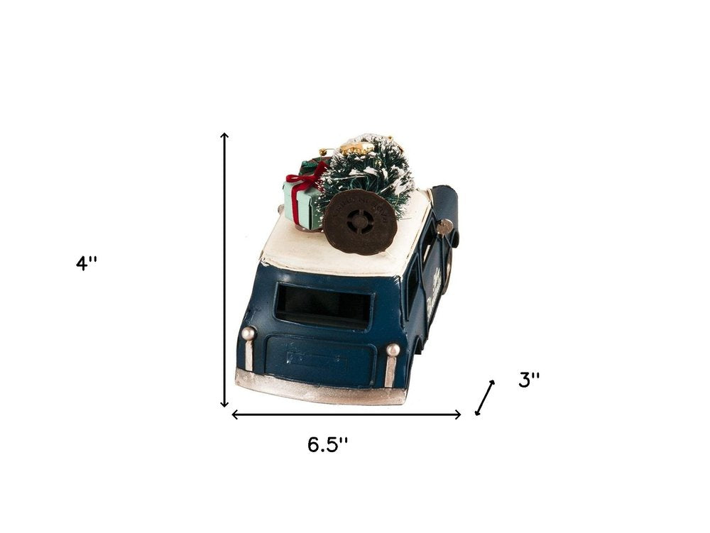 An authentic and jolly replica of the iconic of the '60s, the c19060s Mini Cooper Christmas Sculpture is a handmade model made of metal and decorated in the spirit of Christmas. It features rolling wheels, beautiful interior details like seats, steering wheel, and gas pedal. Painted in authentic blue and white, and decorated with a Christmas tree and presents on the roof. Perfect decoration piece for shelves or bedside table. 4'' x 6.5'' x 3"
