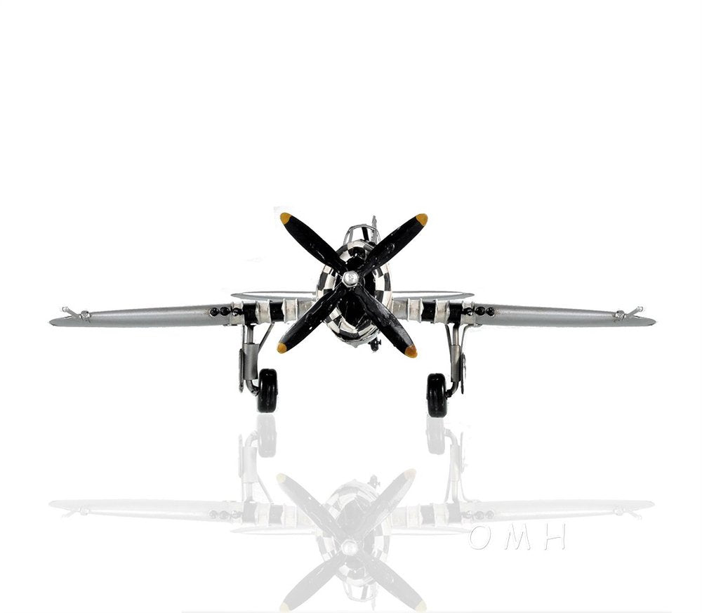 A beautiful replica of the iconic WWII American Army bomber-fighter, the c1943 Republic P-47 Thunderbolt Sculpture is handmade out of metal and accurately detailed. It comes with remarkable details such as landing wheels, a cockpit, a rotating propeller and is painted with authentic WWII paint and symbols. It is a sought-after piece for aviation and WWII enthusiasts. 4.37" x 12" x 14"