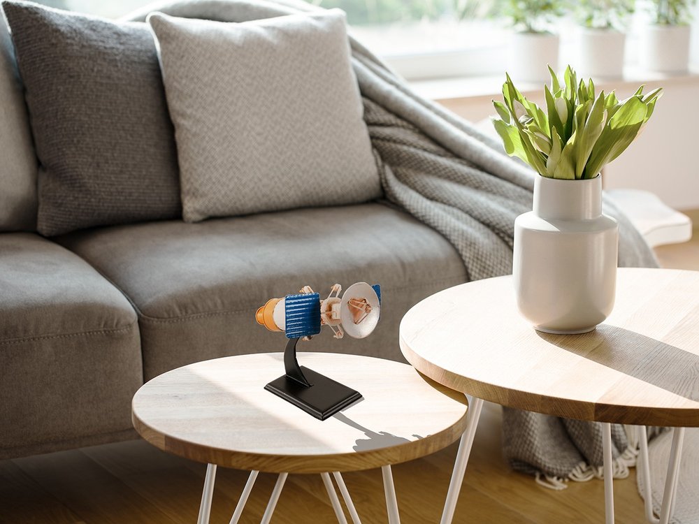 High-quality metal used in this blue and yellow sculpture is both good looking and hard wearing. This replica makes a great tabletop accent for your coffee table, desk, bookshelf, dresser or mantle. A perfect decorative addition for anyone who loves nostalgia and vintage style models and replicas. It's a perfect addition for those who love an up-to-the-minute look and feel. 8-inch h x 8.5-inch w x 7-inch d.