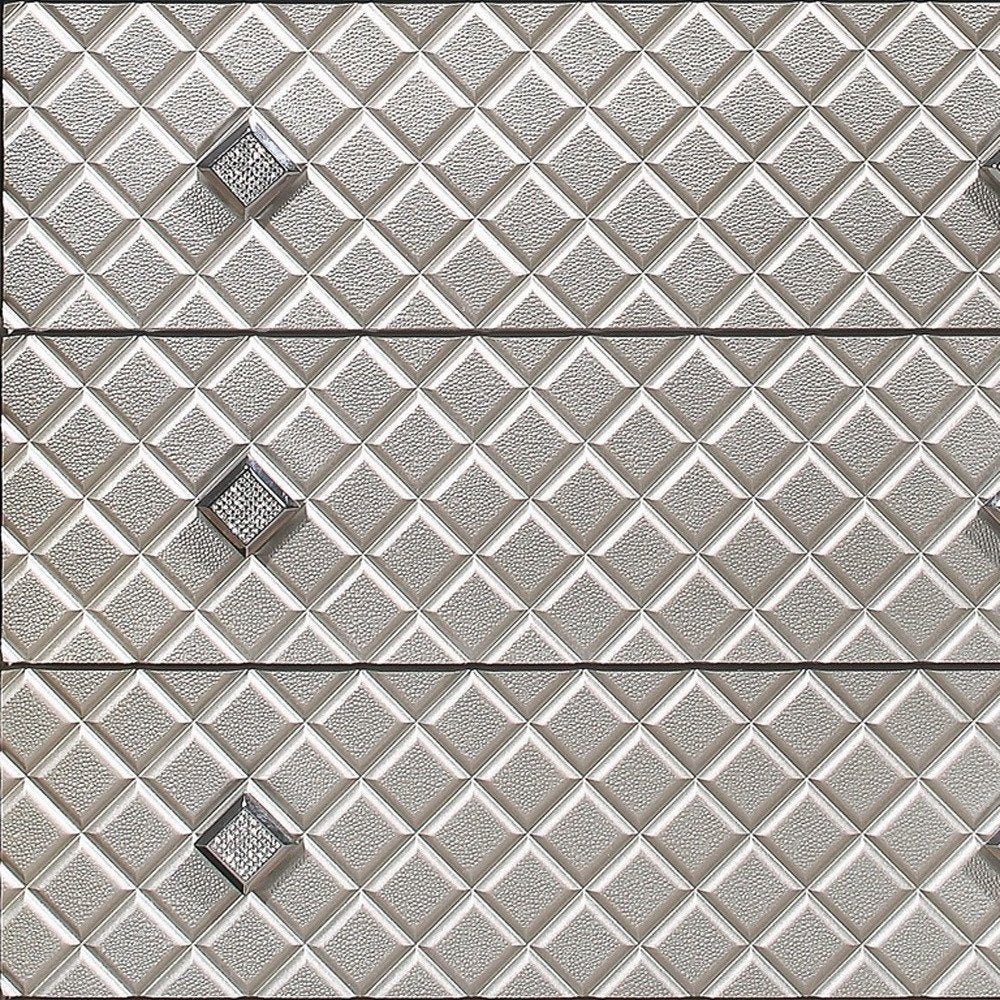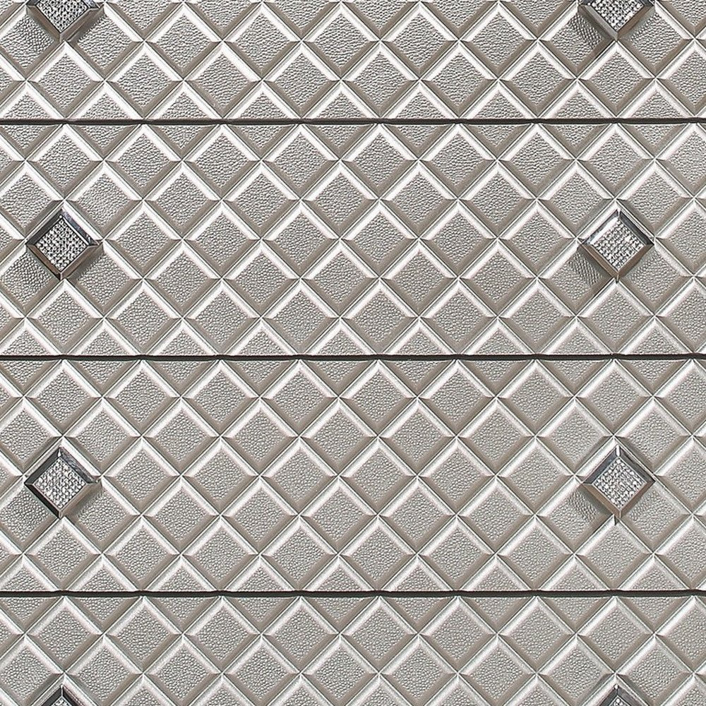 An elegant, eye-catching transitional style chest. This chest highlights the notion that exquisite look and abundant storage options can be united into one graceful yet functional piece. From the gorgeous champagne toned top and base, to the lovely mirror accents, this chest will add elegant notes to your room setting without sacrificing function. Drawer fronts feature jeweled embellished drawer knobs in a striking diamond motif that together create a beautiful, graceful look. Tapered acrylic legs and tasteful design accents add additional graceful appeal to this piece. Ample drawer space makes this piece supremely practical and an efficient way to keep your room neat and tidy. Quality craftsmanship in every facet of production, ensures durability and long-lasting wear. This chest is the perfect way to make your bedroom comfortable and inviting, and the storage space makes this nightstand an absolute winner in versatile and stylish room furnishings.