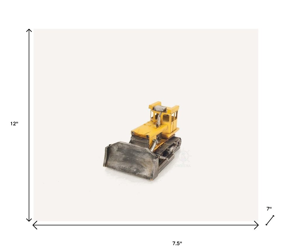 Authentic and super detailed, the c1925 Bulldozer Sculpture is a unique handmade replica of the first bulldozer ever made. It was handmade by a master craftsman in 100% metal and painted in yellow. It features many details such as a heavy wide track, heavy metal plate, gearsticks, and a metal engine. It is a great display piece and a sought-after piece for collectors and enthusiasts. 7'' x 12'' x 7.5"