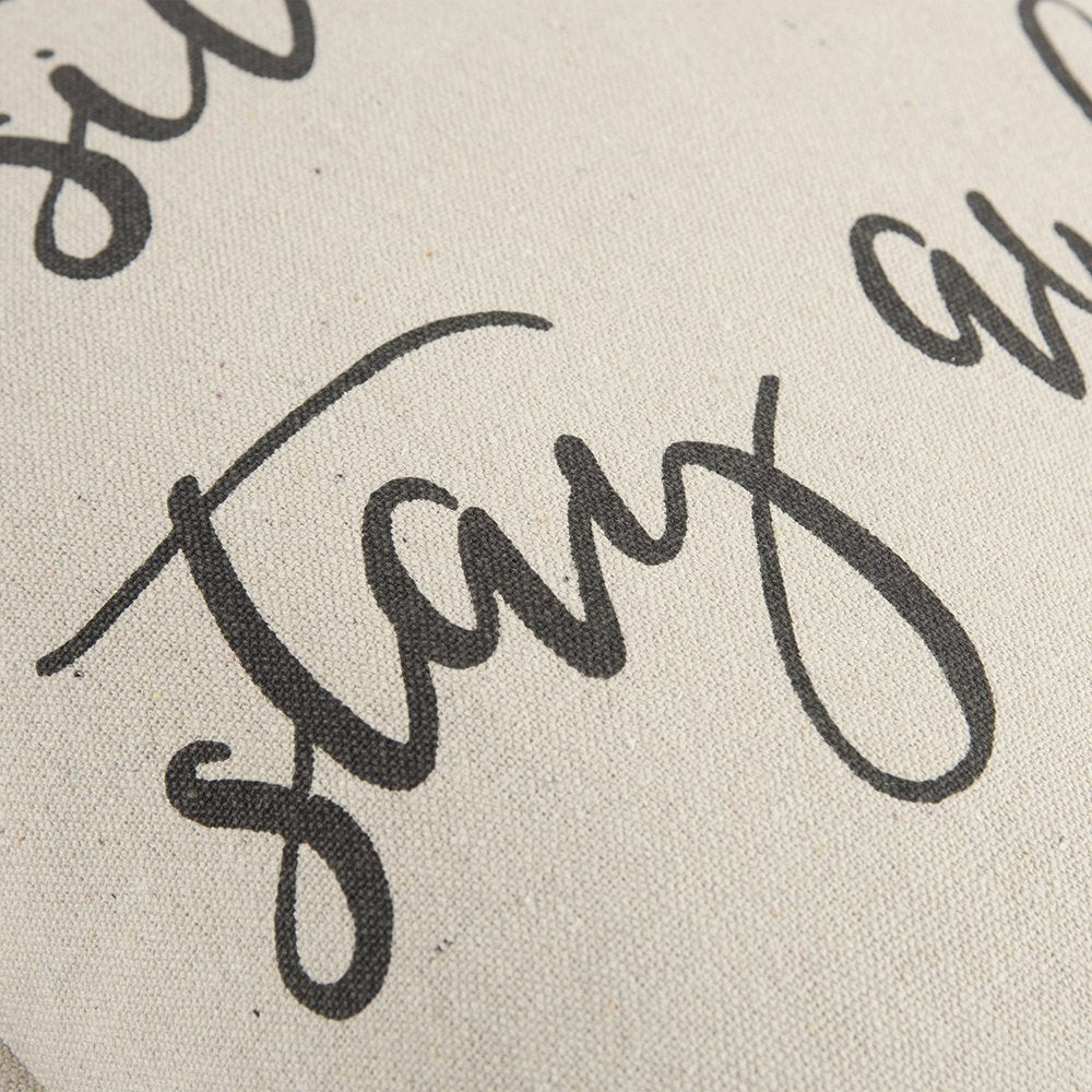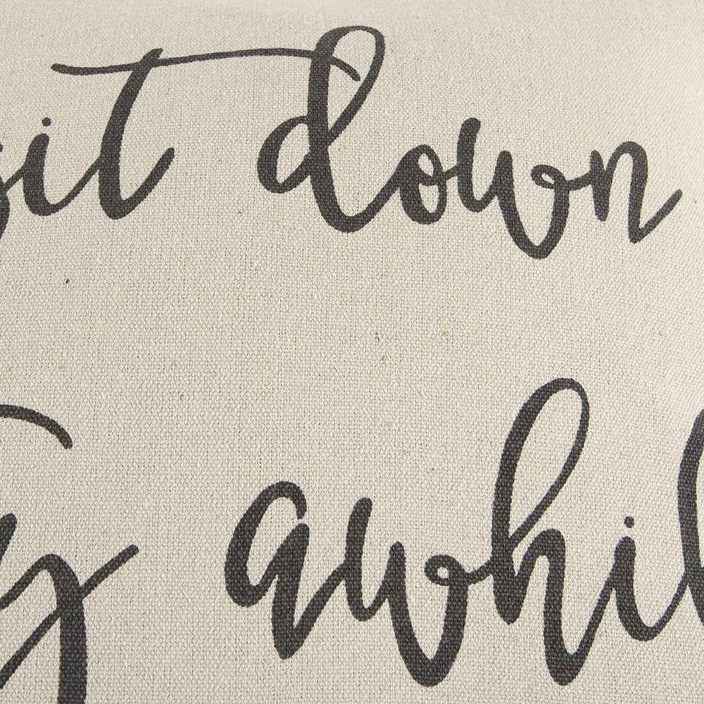 Bring a relaxing vibe into your modern home with this simple yet stylish Gray Cream Stay Awhile Decorative Throw Pillow on the sofa or couch. Featuring a whimsical expression that says “sit down stay awhile” in a pretty cursive font, the pillow exudes an emotional and inviting vibe while giving a light texture to the piece. The soft and neutral hues of the pillow with the thoughtful verbiage make it an ideal accent piece to add a modern flair to your living space. The embroidered flange edges are meant to prevent fraying and lend a sophisticated look to the pillow. The solid coordinating back features a hidden zipper closure for ease of fill and cleaning. Bring a sense of character into your contemporary home with this decorative throw pillow in the room. 20” x 20” x 6.25”