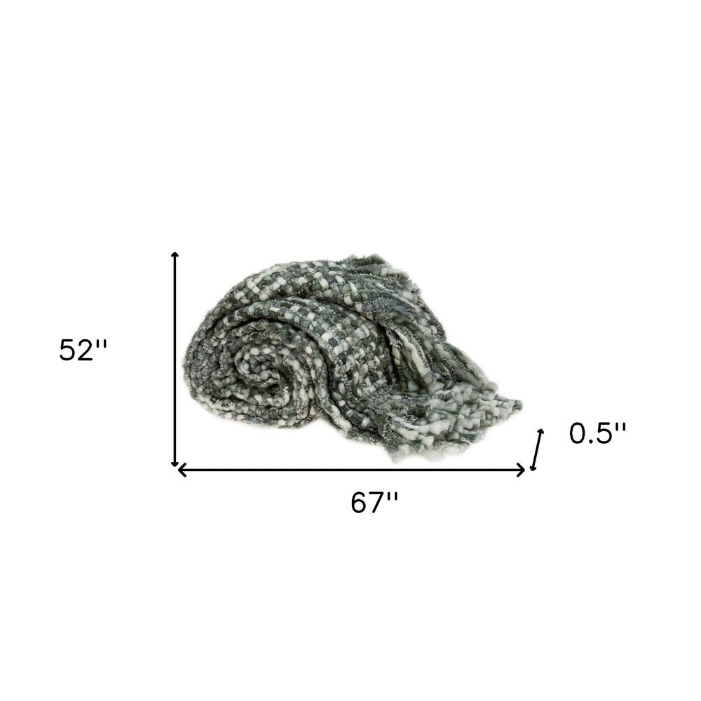 Green and White Knitted Cotton Blend Abstract Throw Blanket with Fringe