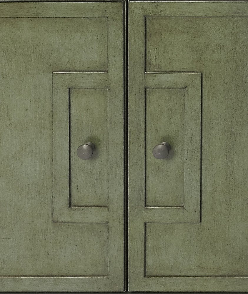 Storage vessels don't have to be unsightly. Increase your storage space and the fashion quotient of your room with this hard-wearing, versatile, and good-looking green sideboard. Crafted from solid wood, this transitional style cabinet features two drawers and shelves, providing ample storage options. The solid wood countertop adds an elegant touch, while the included doors offer additional convenience. Elevate your living space with this stylish and functional sideboard that seamlessly combines form and function. 30-inch H x 31-inch W x 14-inch D