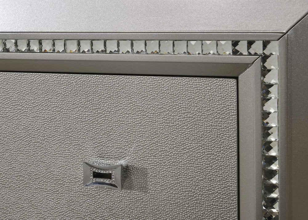 This bed provides a commanding presence in any room. This contemporary storage bed in champagne finish features a fabric padded rectangular headboard and a low-profile footboard with storage drawers. Crafted with a transitional look that is an ideal addition to any bedroom, the headboard is accented with LED lights and a crystal-like sparkling trim.