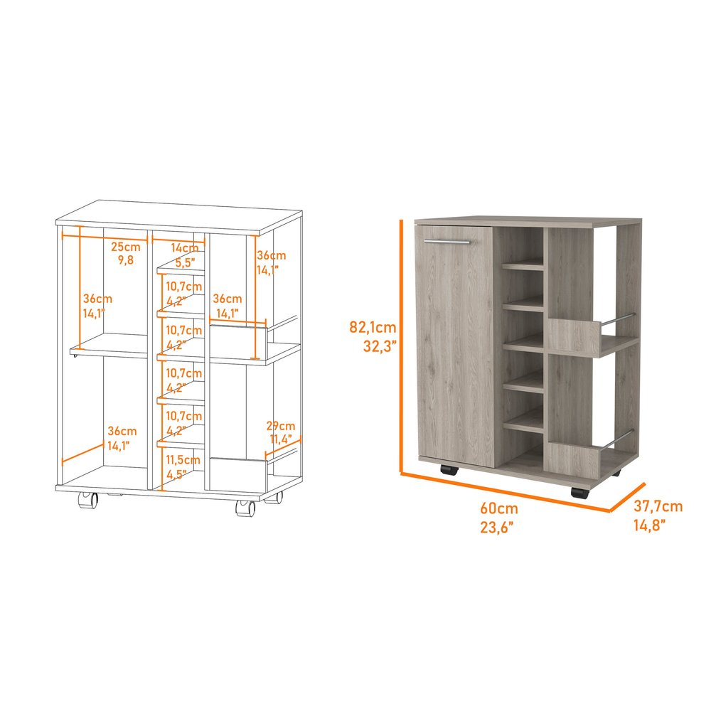 The light gray rolling bar cart with wine storage is a stylish and modern addition to your home decor. Crafted from high-quality manufactured wood, this bar cart features a spacious rectangular shape that provides ample space for serving and displaying your favorite drinks. The light gray color adds a touch of elegance to any room, while the convenient wine storage cabinet holds up to 6 bottles, keeping them within easy reach. Equipped with wheels, this bar cart can be easily moved around, allowing you to entertain your guests wherever you please. With its sleek design and functional features, this bar cart is the perfect choice for hosting parties or simply enjoying a glass of wine in style. 32.32-inch H x 23.62-inch W x 14.76-inch D