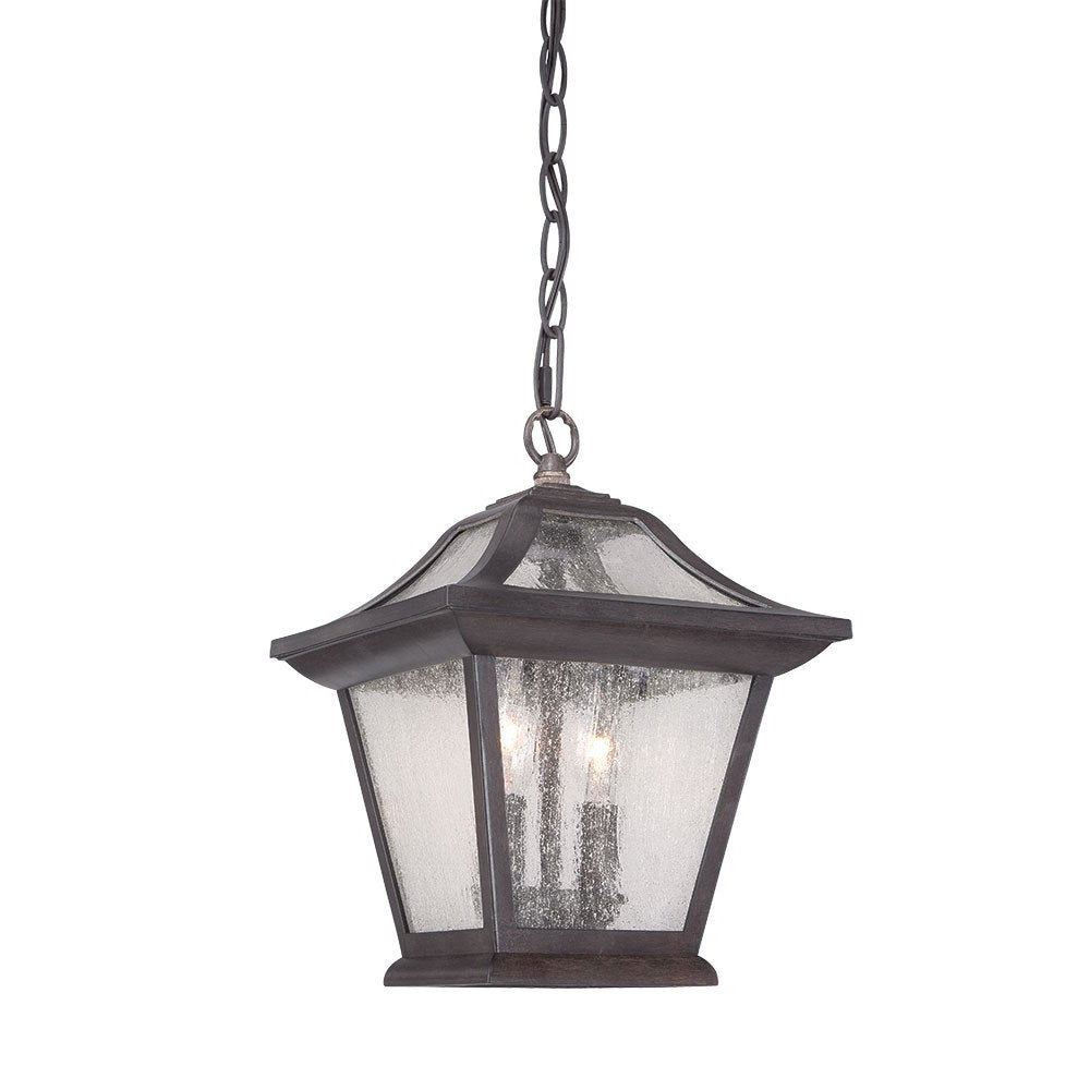 Bring in a combination of traditional and whimsical décor to the exterior walls of your home with this Matte Black Birdhouse Shape Outdoor Hanging Light. The hanging chain has a small chain links and is attached to a circular hook. The circular hook holds the birdhouse shaped light up. The birdhouse has a sloping roof with a tapered body ending in a solid base. The roof and body have glass panels lining the frame. The clear waterfall effect glass with the matte black frame will bring in a lot of character to any space you use this light in. There are two bulb holders inside the light for more brightness. 12" H x 9" W x 9" D