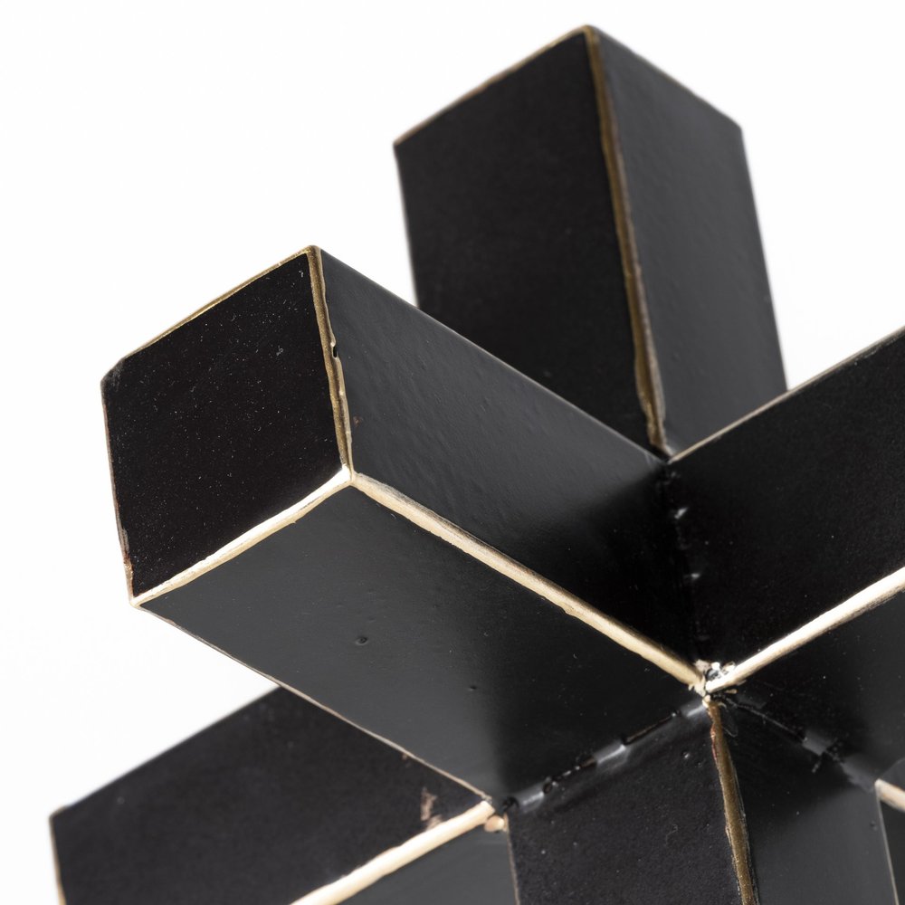 Unique and decorative, this 6-inch black metal tabletop sculpture is a stunning addition to any living room. Crafted with high grade metal through machine-made manufacturing, this contemporary piece captures the essence of nature effortlessly. Its sleek black color adds a touch of elegance to your decor, making it perfect for those who appreciate a stylish aesthetic in their living space. 6-inch h x 7-inch w x 8-inch d.