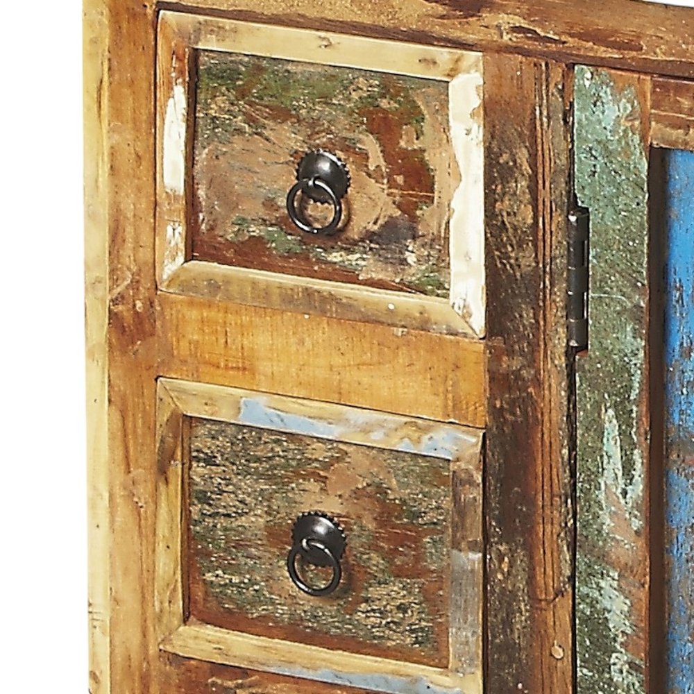 Storage vessels don't have to be unsightly. Increase your storage space and the fashion quotient of your room with this hard-wearing, versatile, and good-looking cabinet. Crafted from solid wood, this transitional style sideboard features three drawers and shelves for efficient organization. Its brown, green, and gray color palette adds a touch of elegance to any room, while the solid wood countertop provides a sturdy surface for display or serving. Complete with doors for concealed storage, this sideboard is both practical and stylish, making it a perfect addition to your home decor. 33-inch H x 43.5-inch W x 15.75-inch D