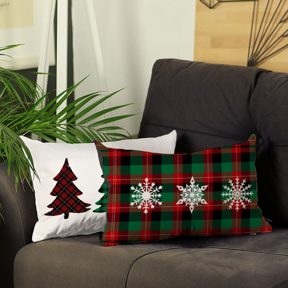 Bring some Christmas fun and folly to your space with this mixed set of Christmas Tree Trio Plaid and Christmas Snowlake Trio Plaid Printed Lumbar Pillows. Crafted in a super soft brushed polyester, this rectangular lumbar support shape pillow cover has high-quality digital printing on the front while the backside is a solid natural color. There is a hidden zipper closure that gives a clean and seamless look all the way around. The removable and super soft insert is filled with high-quality polyester that is designed to resist clumping and matting to provide maximum comfort and softness. 12" X 20" each. Set of 2.