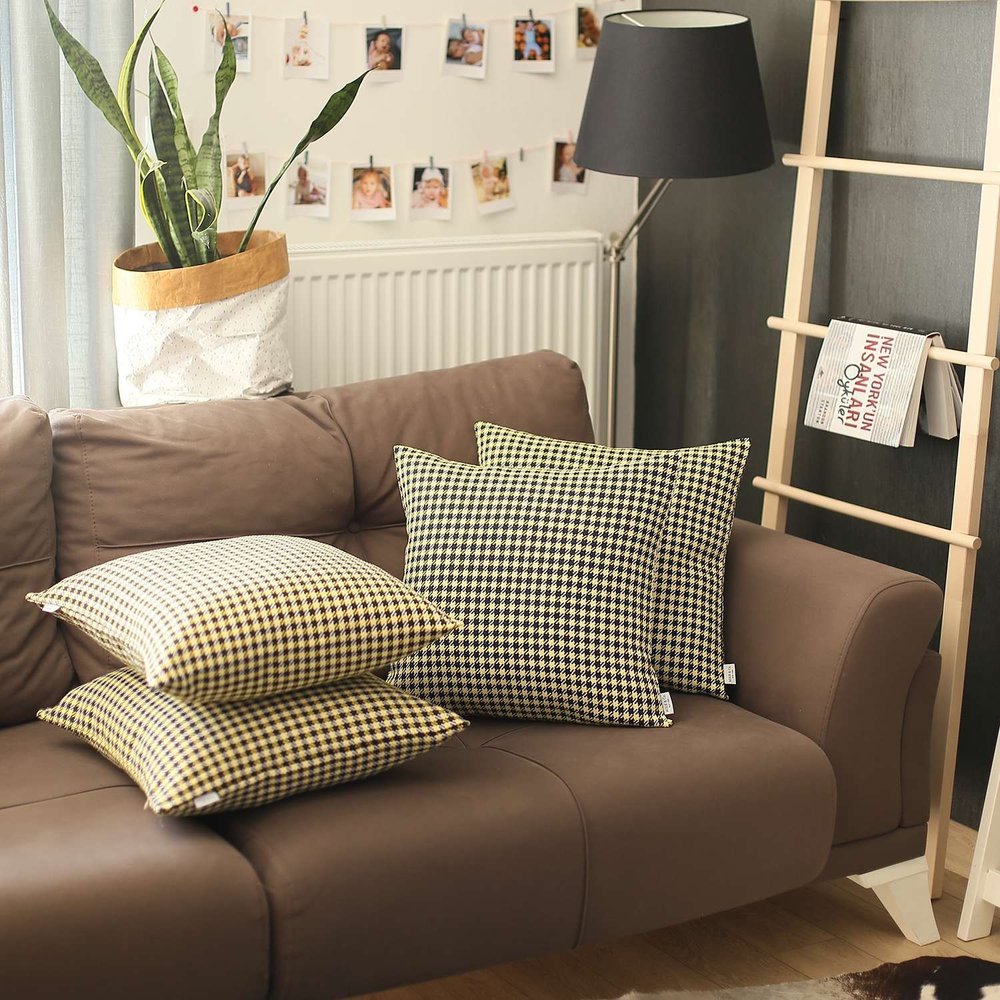 Decorate your living space with this Set of 4 Pale Yellow Houndstooth Pillow Covers that adheres to a classic pattern with a subtle color palette. Beautifully designed with black houndstooth patterns in jacquard weaving on a pale yellow base to keep it simple yet sophisticated amidst any surrounding. Handmade in Turkey with 100% premium polyester fabric to ensure durability and color intensity while the OEKO-TEX Standard 100 certification speaks of its top-notch product quality and safety. The edges feel smooth and refined due to its hidden zipper closure. Aligning with the aesthetics of contemporary styling, this set of 4 pillow covers will add an understated elegance to your modern home. 18” x 18” each. Set of 4.