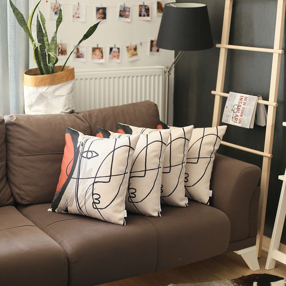 Add some boho-chic charm to your living space with this Set of 4 Red Boho Chic Printed Pillow Covers. The bold linework of this piece is used to create an abstract face mural with red accents on the side over a soft ivory base to create visual intrigue. The unique charm of this cover combined with the amiable color palette makes it ideal for an array of indoor styles. Hand-made by Turkish craftsmen, this pillow cover uses high-quality OEKO-TEX Standard 100 certified polyester fabric and has hidden zipper closures. By only spot cleaning marks and blemishes, you’ll be able to keep this cover looking seamlessly beautiful for ages. Place this set of 4 pillow covers with bold and dark colors and watch the mural come to life while bringing the whole look together. 18” x 18” each. Set of 4.