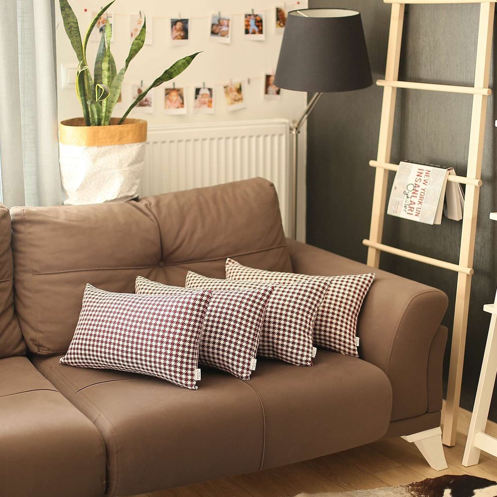 Upholding a rich and luxurious vibe, this Set of 4 Red Houndstooth Lumbar Pillow Covers will be a sophisticated addition to any modern or contemporary setting. Featuring the classy houndstooth checkered pattern in black and maroon red over a cream-toned base, each cover accentuates an elegant combination. Flaunting the creativity of Turkish artisans, these pillow covers are handmade of OEKO-TEX Standard 100 certified polyester fabric to ensure quality and product safety that will last for ages with low maintenance. The hidden zipper closure adds to a smooth finish for a soft and sumptuous feel on the touch. Besides serving as a sophisticated accent to complement any furniture, this set of lumbar pillow covers will enrich the ambiance of any modern or contemporary living space. 12” x 20” each. Set of 4.