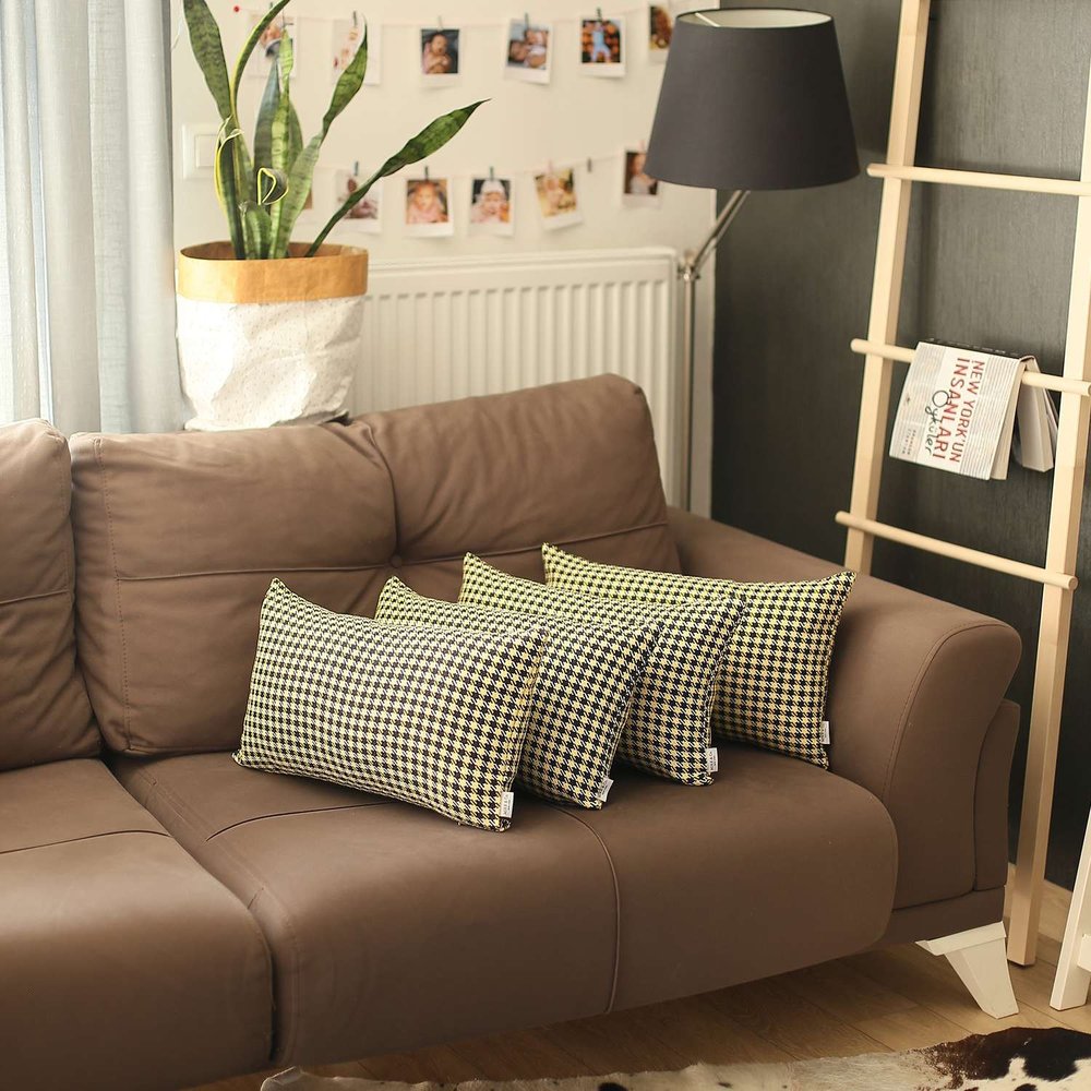 Upholding a rich and luxurious vibe, this Set of 4 Yellow Houndstooth Lumbar Pillow Covers will be a sophisticated addition to any modern or contemporary setting. Featuring the classy houndstooth checkered pattern in black over a pale yellow base, each cover accentuates an elegant combination. Flaunting the creativity of Turkish artisans, these pillow covers are handmade of OEKO-TEX Standard 100 certified polyester fabric to ensure quality and product safety that will last for ages with low maintenance. The hidden zipper closure adds to a smooth finish for a soft and sumptuous feel on the touch. Besides serving as a sophisticated accent to complement any furniture, this set of lumbar pillow covers will enrich the ambiance of any modern or contemporary living space. 12” x 20” each. Set of 4.