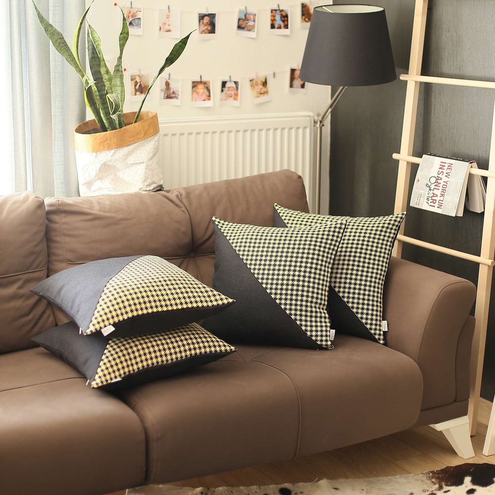 Sleek, sophisticated, and stylish, this Set of 4 Yellow Houndstooth Pillow Covers will tie together the aesthetics of any modern or contemporary decors. Handmade in Turkey with durable polyester fabric which is OEKO-TEX Standard 100 certified to ensure product safety and optimum quality. The fabric should only be spot cleaned to keep its pristine look for years to come. Featuring the houndstooth checkered pattern in black and yellow diagonally separated from the solid charcoal black surface to create visual intrigue. Made to feel soft and seamless on the touch, the hidden zipper closure all around does the trick. Place this beautiful set of pillow covers on the sofa, couch, or sitting area and it will add a stylish edge to the entire room. 18” x 18” each. Set of 4.