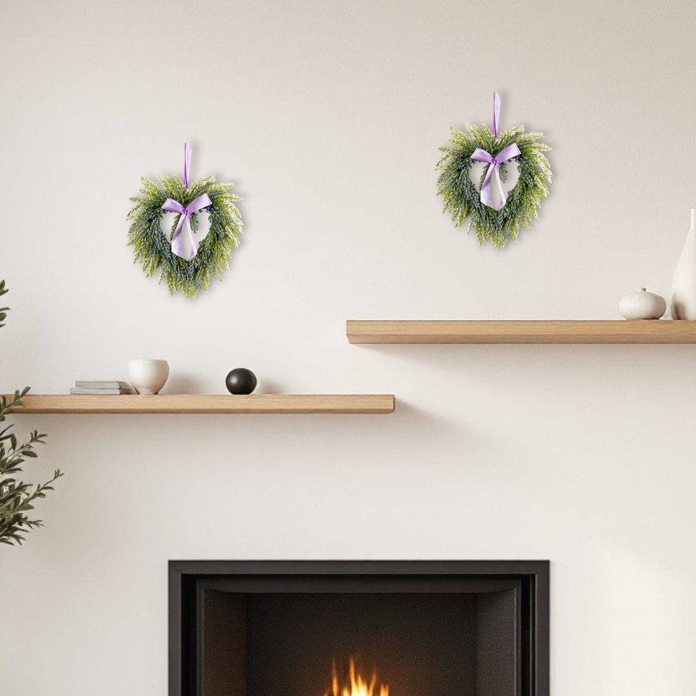 Made to mimic the real thing, this artificial wreath stays green year after year, with no watering needed. Features a unique heart design. This lovely wreath makes a wonderful gift and is sure to brighten someone's day. The enchanting lavender plant species adds a touch of elegance, while the traditional style provides timeless charm. Crafted from twigs, its beautiful green and purple hues create a delightful contrast. Perfect for covered outdoor use, this heart-shaped wreath enhances any space with its inviting presence and includes two pieces for versatile decorating options. 10-inch h x 9-inch w x 7-inch d.