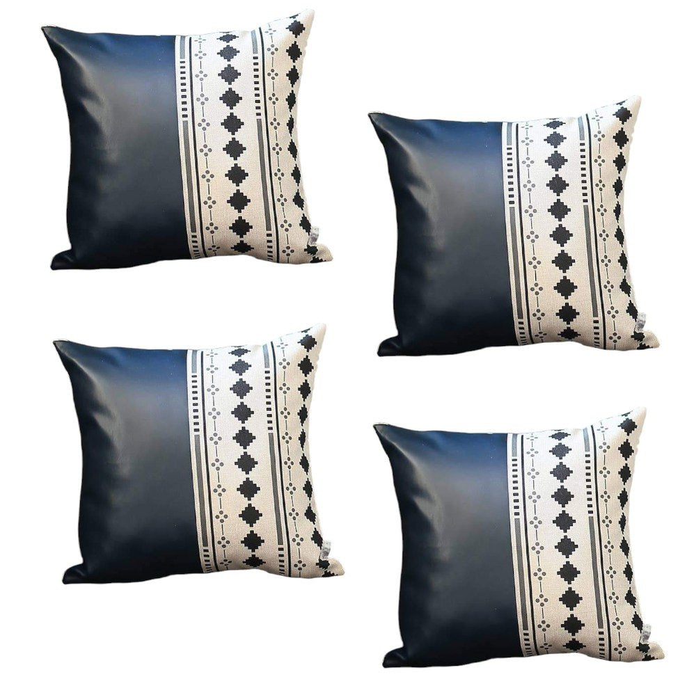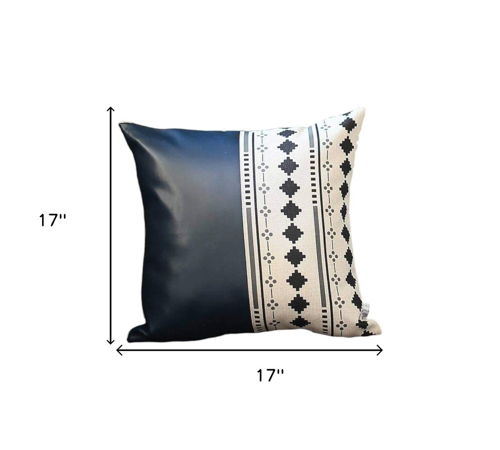 Set of Four 17" Navy Blue Diamond Fabric and Faux Leather Throw Pillows