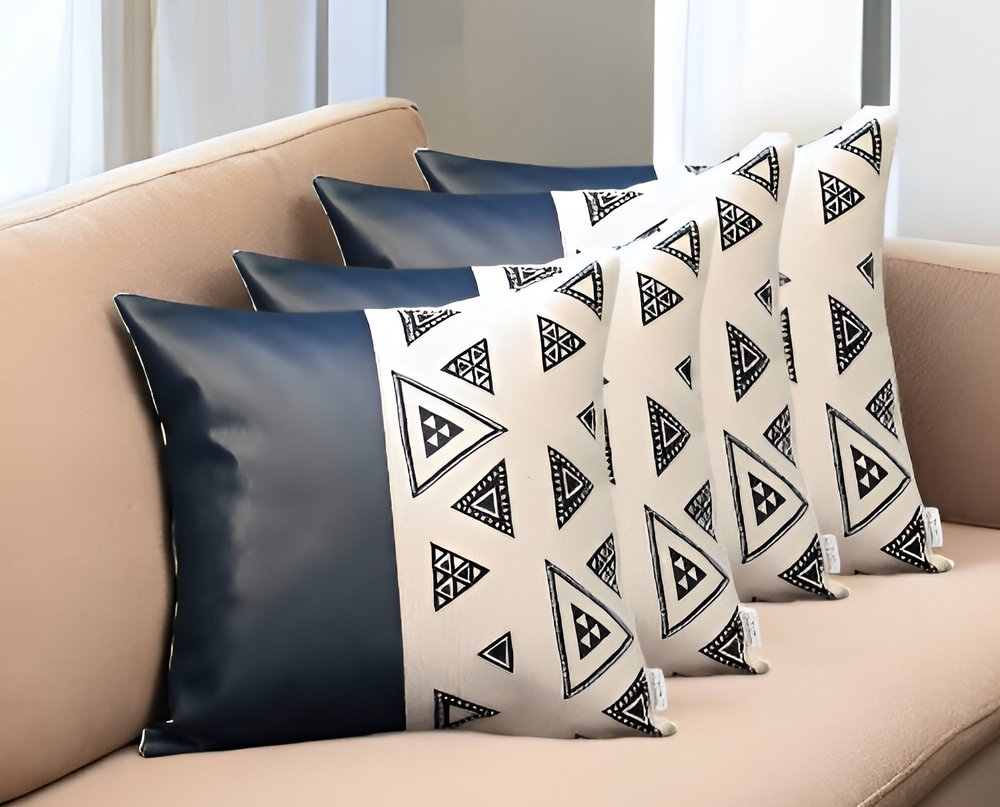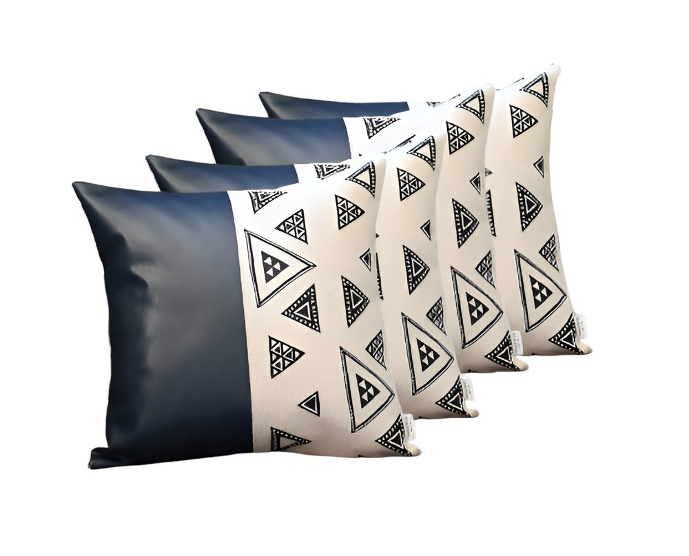 Unique and decorative, this comfortable set of four 17" x 17" navy blue faux leather geometric zippered pillow cover will leave a lasting impression. Ultra durable navy blue faux leather has been used to make this decorative pillow cover set a beautiful look that will stand the test of time. This soft no fill pillow not only is decorative but made to be comfy and cozy all day long. Great to use on its own or mix with other decorations for the perfect look. A great decorative accessory for your favorite chair, to accent your sofa, or to use as part of your bed ensemble. 1.6" H x 17" W x 17" D