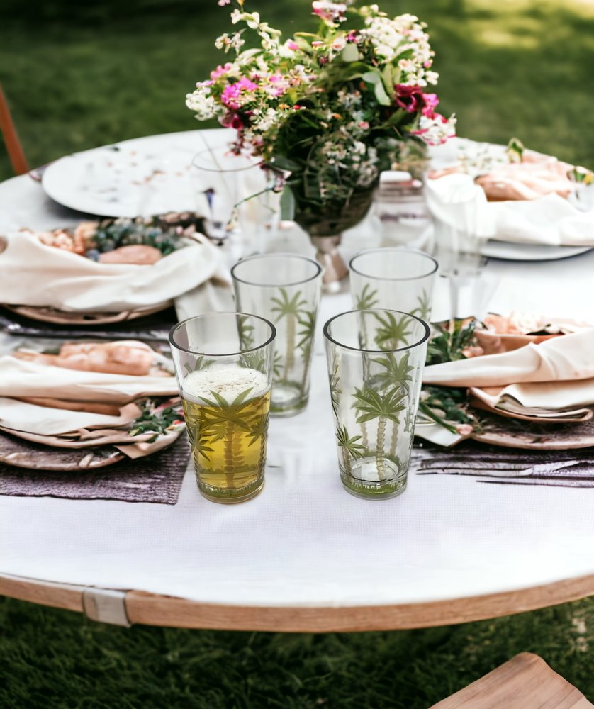 Indulge in your preferred drinks with this set of four clear and green palm tree acrylic highball glasses. Great for cocktails, but also ideal for everyday drinks including water. Whether you are entertaining or simply enjoying a drink by yourself, a quality set of stemware is a must-have. The addition of a machine embossed design gives this glass special character and dimension. Imbibe in style with this good looking and eye-catching palm tree design. Every drink deserves the perfect glass, and so do you. 6.38-inch H x 4.88-inch W x 4.88-inch D