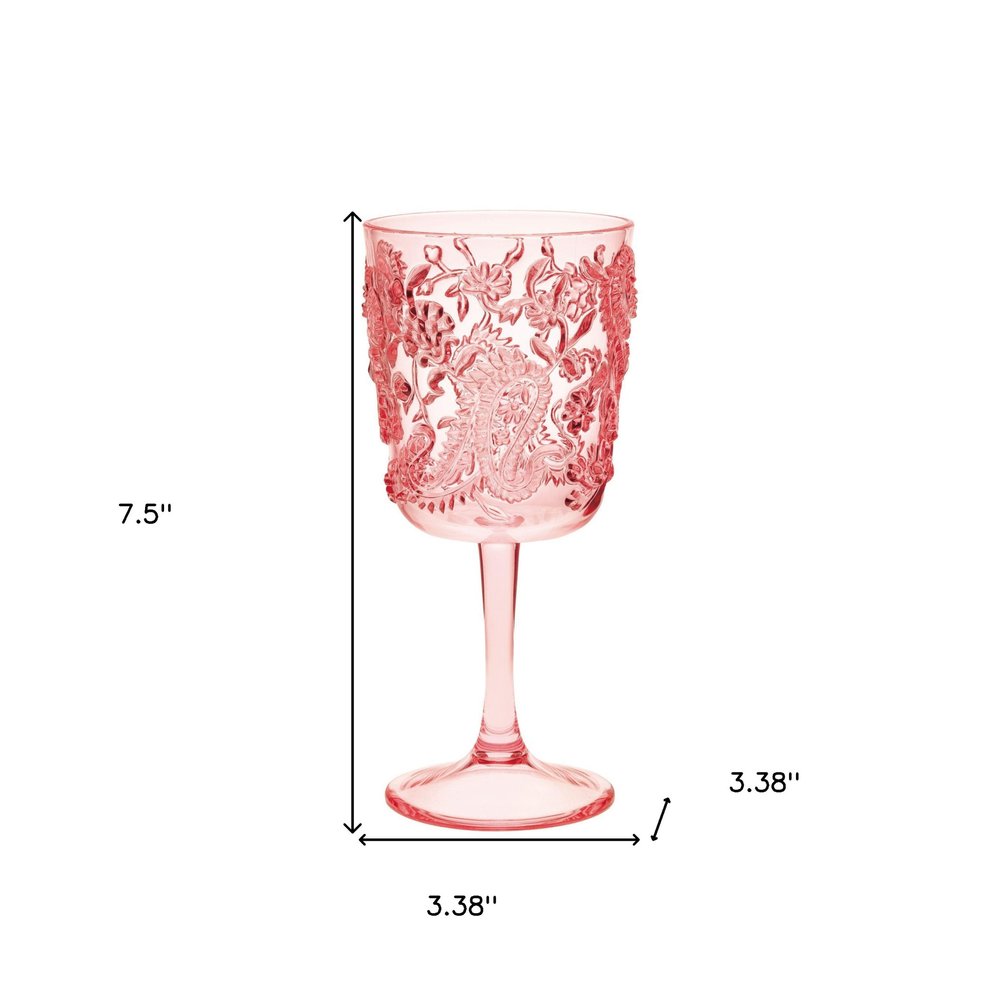Add the set of four pink paisley acrylic stemmed all purpose wine glass to your drinkware collection for a great all-purpose option. Elevate any occasion with a set of stunning stemware that is as functional as it is beautiful. Stemmed drinkware allows you to hold your drink without the heat of your hand impacting it’s contents. The addition of a machine embossed design gives this glass special character and dimension. Bring a pop of personality to your kitchen or dining room with this paisley pattern. The textured surface gives this a unique and dimensional feel. Every drink deserves the perfect glass, and so do you. 7.5-inch H x 3.38-inch W x 3.38-inch D