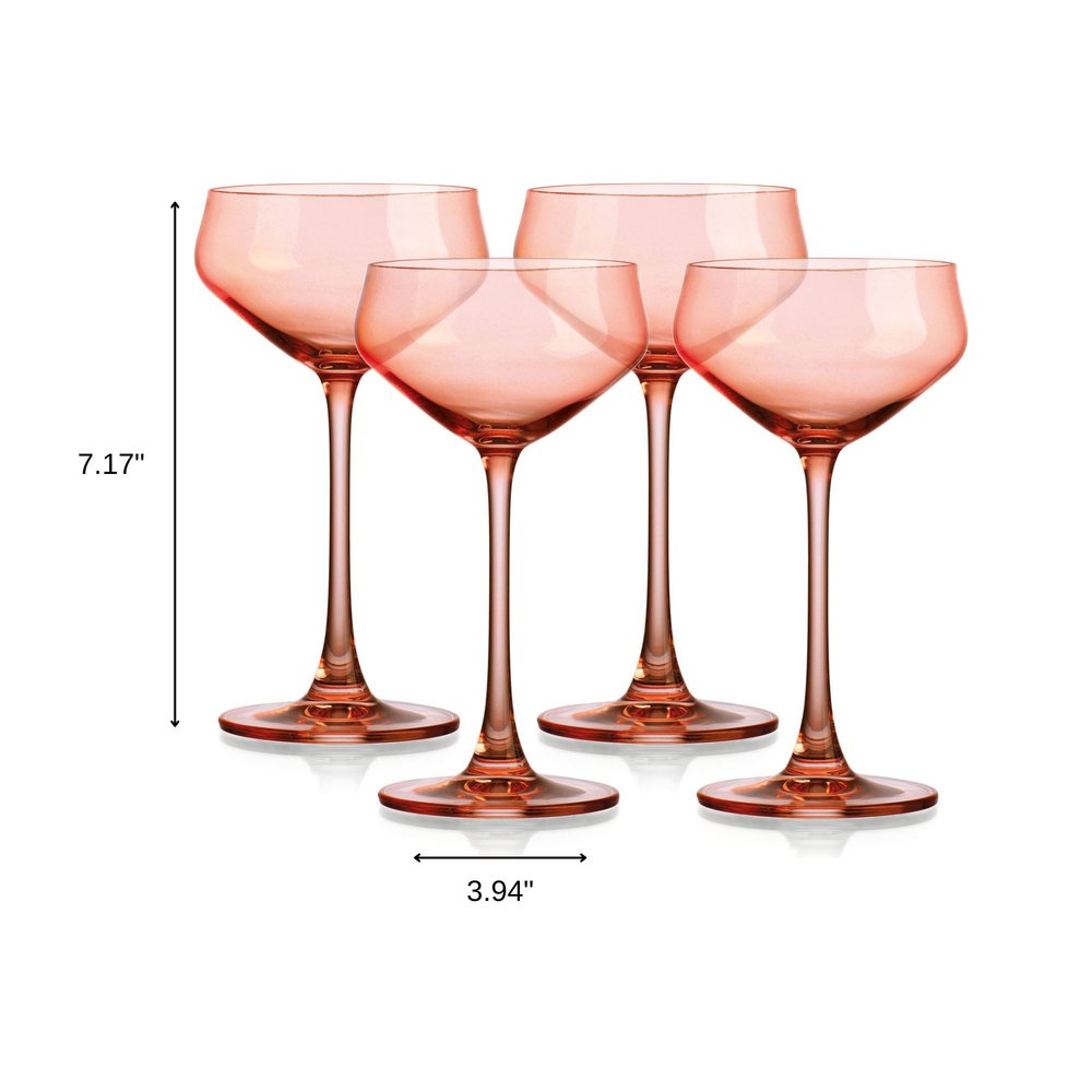 Savor the taste of your favorite cocktail in chic style with this set of four coral crystal shallow bowl stemmed coupe. This glassware set is a perfect addition to any bar or drinkware collection. The graceful stem adds an air of sophistication to your favorite beverage. Includes a decorative clear rim to enhance the look and elegance of the glass. Add iconic style to your setting with this good looking solid_color pattern. The smooth non-texture of this surface will feel elegant and sleek in your hand. Sipping from the right glass can make the difference between a drink and an amazing experience. 7.17-inch H x 3.94-inch W x 3.94-inch D