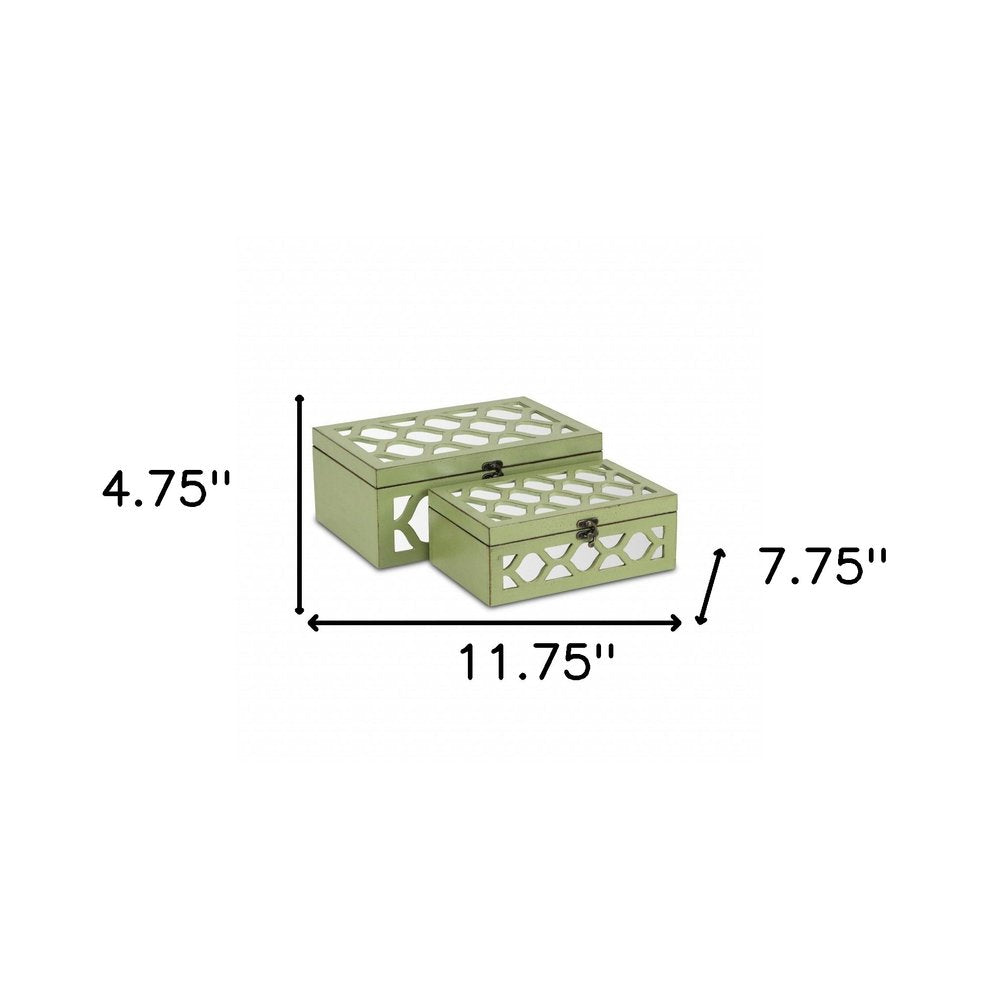 Beautiful decorative yet usable boxes to store your most coveted treasures. Add a touch of colorful design combined with utility to any space in your home with this Set of Two Green Mirrored Wooden Boxes with Mirror Panels. There are two boxes in this set, a larger and a smaller, made from solid wood and mirrored glass. The finish on top gives them a very rich and sophisticated look. The front and top panels of these boxes have an quatrefoil scroll design which has mirror panels behind it. The closing hooks are burnished dark nicel finish to match the overall aesthetic of these boxes. Use these boxes as for jewelry, special storage, or decor. Can be used separately or are stunning stacked together as a set. 4.5" H x 11.75" W x 7.5" D