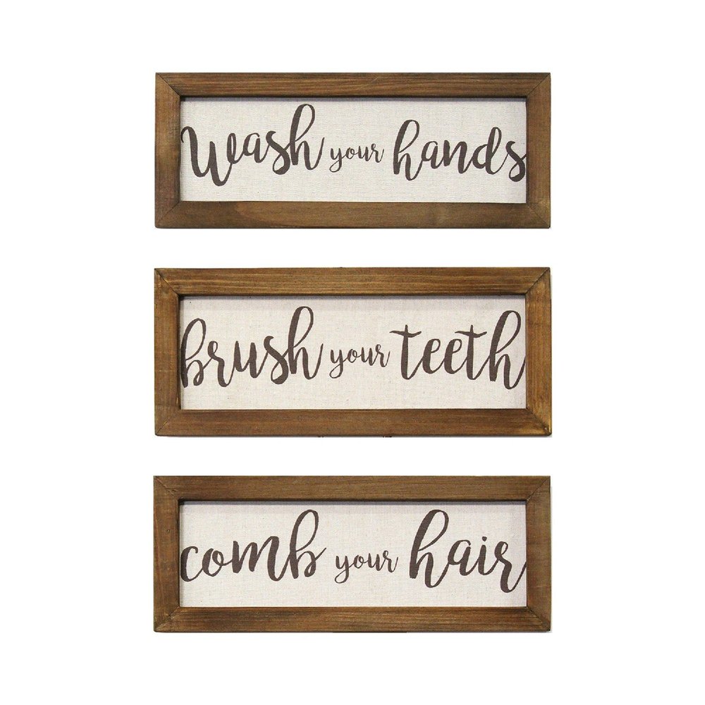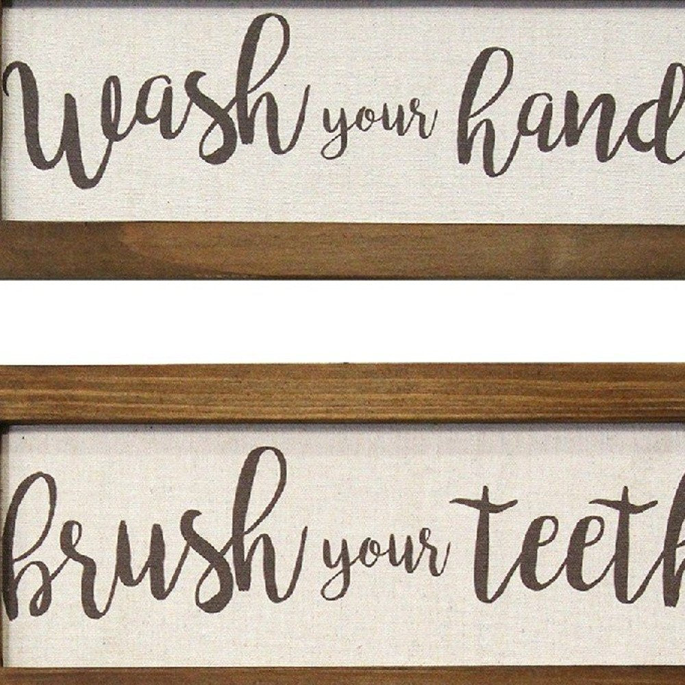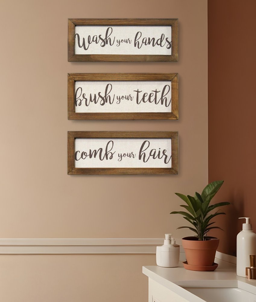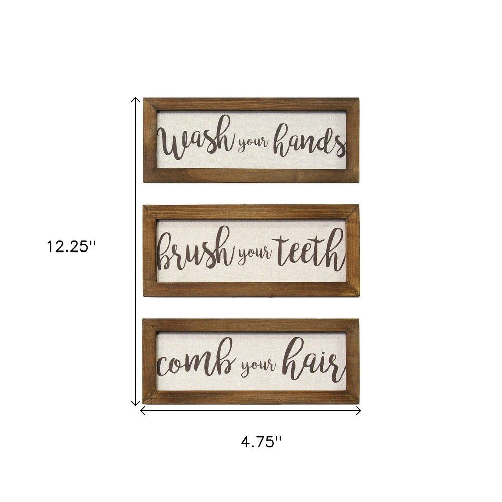 Dress up a plain bathroom wall with Set of 3 Printed Linen Bathroom Rules Wall Art. This handcrafted set features sayings we all grew up hearing, "Wash Your Hands," "Brush Your Teeth," and "Comb Your Hair" and serve not only as delightful wall decor but also as a kind reminder to all, especially little ones. Each is beautifully printed on linen with backer board and finished with a rich brown-stained wood frame. Display them together to create one large "check-off" list or hang them separately around the room for a gentle reminder at every turn. 4.75-inch H x 12.25-inch W x 0.5-inch D