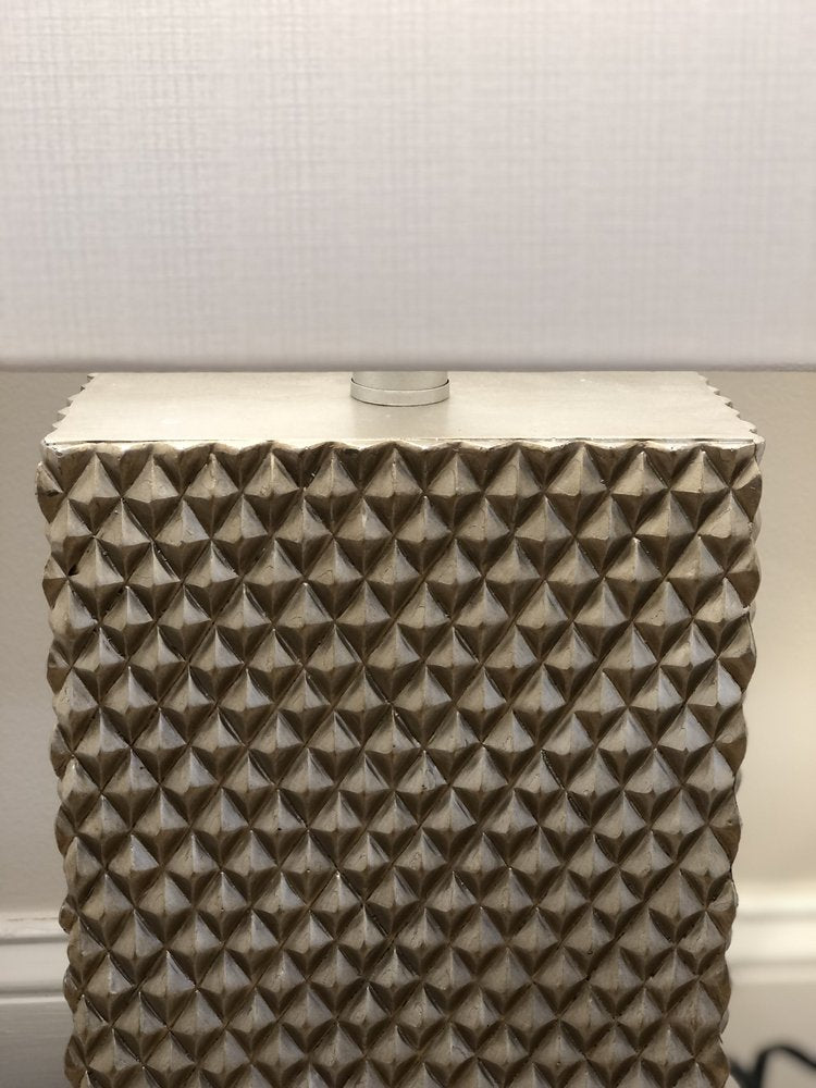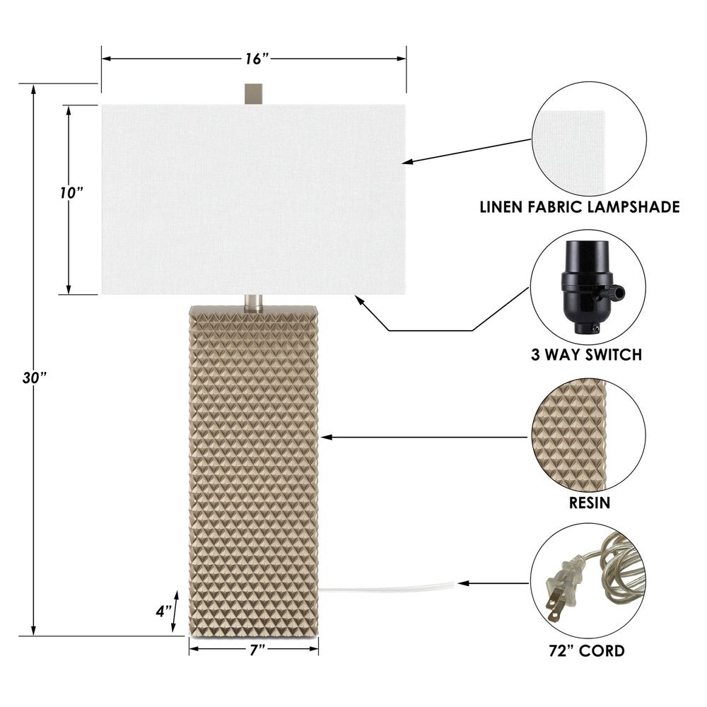 Bring of level of elegance and freshness to your space with this high quality set of two 29-inch gold table lamps with white shade. The gold-tone crisscross waffle design polyresin base of this interesting lamp is topped by a rectangular white linen shade, giving it distance and different lines. Use this lamp anywhere and elevate the look of the whole space. It is perfect for virtually any decor. 29-inch H x 8-inch W x 15-inch D