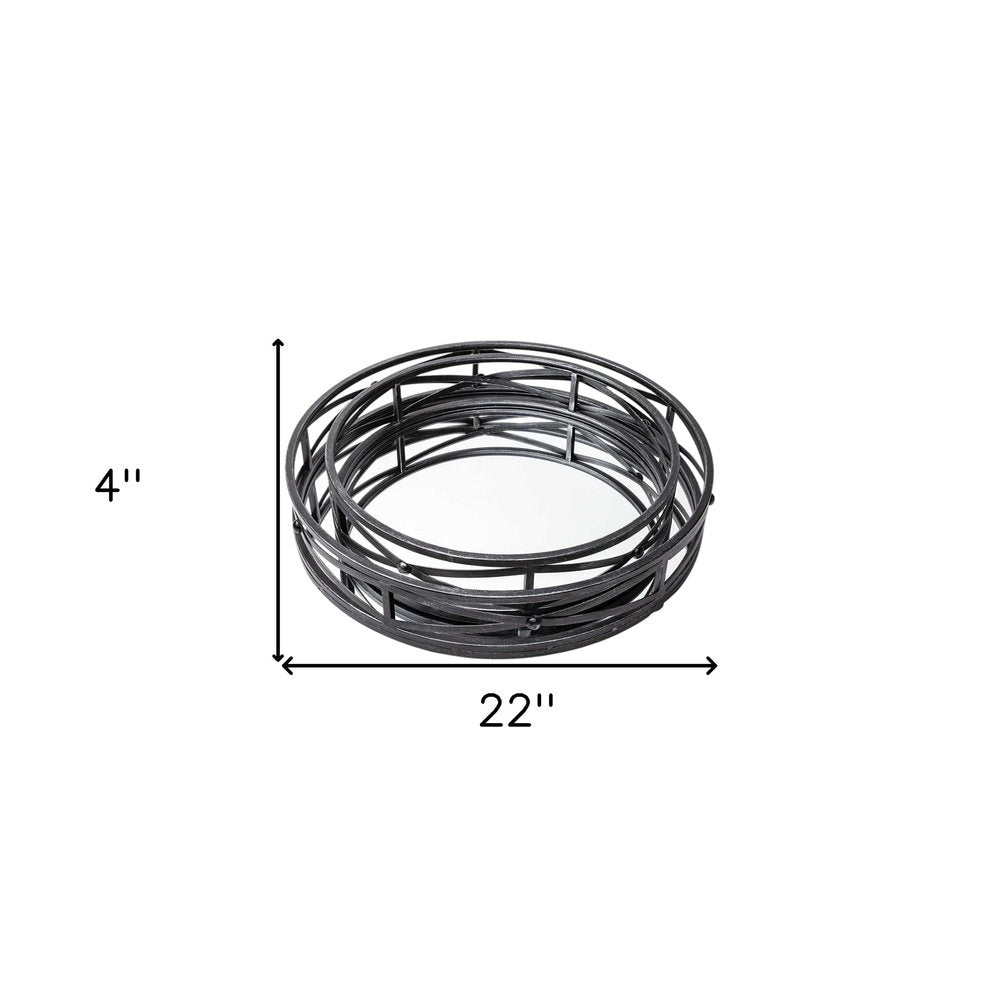 This set of two black round metal and mirrored glass vanity trays will add a beautiful decorative accent to your decor. Matte black metal wire in an abstract geometric pattern surrounds these round trays for a unique and modern look that is accented by mirrored glass on the flat surface. Comes with two pieces that can be used separately or together. If you get creative, these trays with their mirrored flat surface can even be hung up on the wall as accent decor!. 4-inch h x 22-inch w x 22-inch d.
