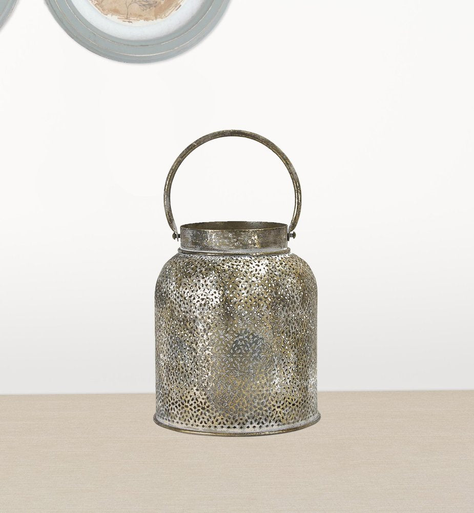 This set of two gold distressed metal tabletop taper candlesticks is a great addition to your home decor and sure to complement your existing furniture. This candleholder is the perfect illuminating design to accent your space in style. Candleholders are a decorative accent on their own. With our without candles. 9-inch h x 7.75-inch w x 7.75-inch d.