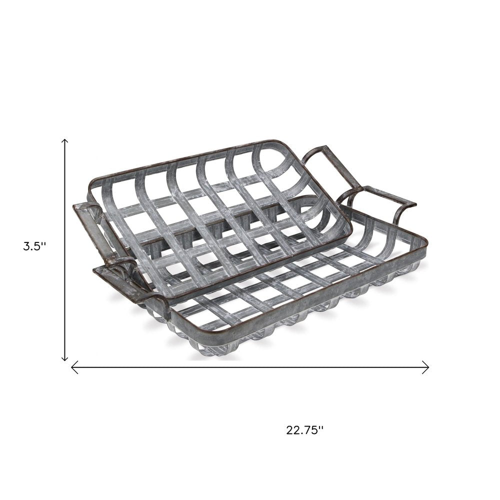 Freshen up your space with this convenient and good looking 23" gray rectangular metal handmade tray with handles! Crafted from sturdy and durable metal, this rectangular tray is versatile enough to blend with a variety of color palettes and aesthetics. Designed with handles for easy transport and convenience. Food safe and versatile, this tray is sure to please. 3.5" H x 22.75" W x 11.75" D