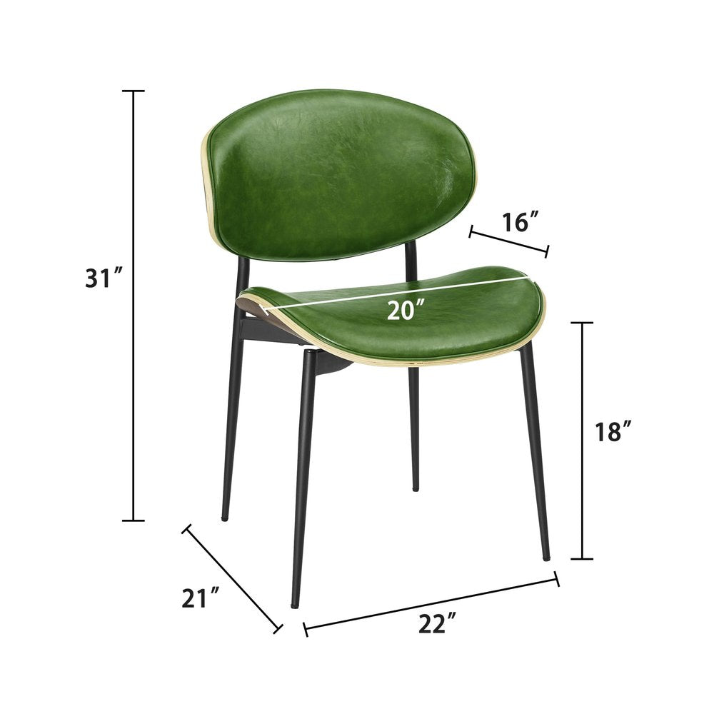 Make your dining room stand out with the set of two green and black upholstered faux leather curved back dining side chairs. The side chair has no arms so it can easily fit around the table. Can also be used as an accent in living room or bedroom. Complete with bentwood back, this chair not only looks good but is comfortable. Dining chairs are a great way to compliment your kitchen or dining room but can also be used in the foyer, hallway, or any room you might need extra seating. 31.5-inch h x 21.85-inch w x 21.9-inch d.
