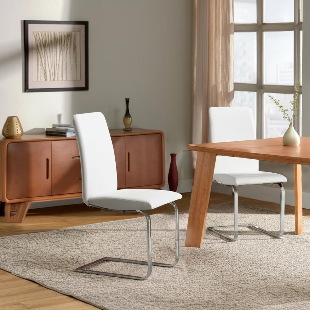 This set of two white and silver upholstered leather dining side chairs is not only good looking, but it also provides long lasting support. This armless chair has a sleek silhouette making it ideal for seating around the table but can also double as an accent chair. Complete with solid back, this chair not only looks good but is comfortable. Dining chairs are a great way to compliment your kitchen or dining room but can also be used in the foyer, hallway, or any room you might need extra seating. 38-inch h x 17.33-inch w x 23.23-inch d.