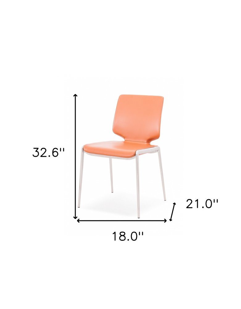 Bring this comfortable set of two terra cotta and silver upholstered faux leather dining side chairs to your table to enjoy long lasting quality time with your family and friends. This armless chair has a sleek silhouette making it ideal for seating around the table but can also double as an accent chair. The solid back gives this chair its unique style. Dining chairs are a great way to compliment your kitchen or dining room but can also be used in the foyer, hallway, or any room you might need extra seating. 32.6-inch H x 18-inch W x 21-inch D