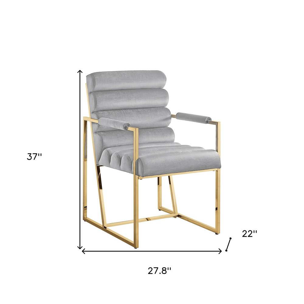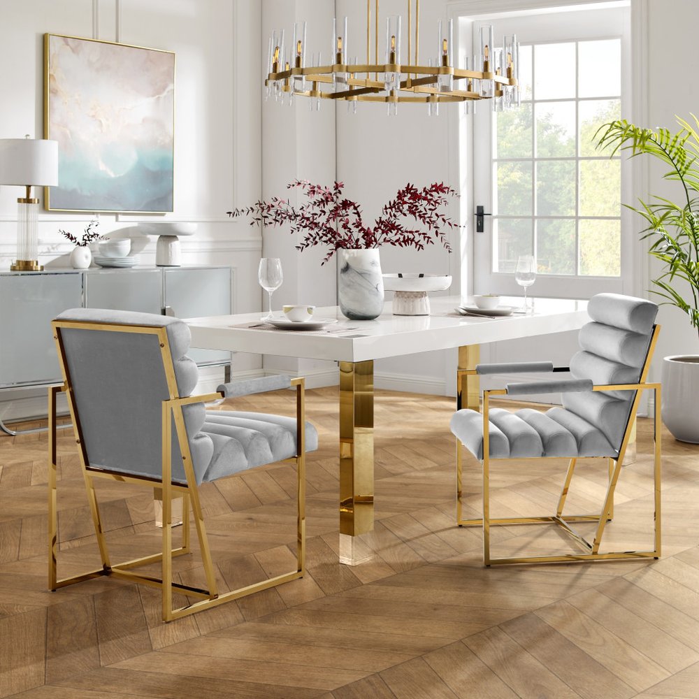 Make your dining room stand out with the set of two tufted navy blue and gold upholstered velvet dining arm chairs. The addition of a tufted design gives this chair some extra special flair. The solid back gives this chair its unique style. Dining chairs are a great way to compliment your kitchen or dining room but can also be used in the foyer, hallway, or any room you might need extra seating. 37-inch H x 27.8-inch W x 22-inch D