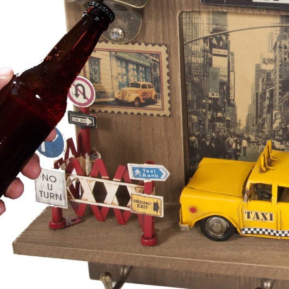 This vintage shadow box features the famous new york city checker taxicab. In the background is the picture of always busy times square. Hang this shadow box in your room to store your car keys or open that cold beer with the handy attached bottle opener. Other features and details include: - Metal Self Serve Bottle Opener - Handmade Metal taxi with turnable wheels - Red, yellow and green traffic light and one-way street sign - 3 metal keychain hooks - Wood and MDF frame