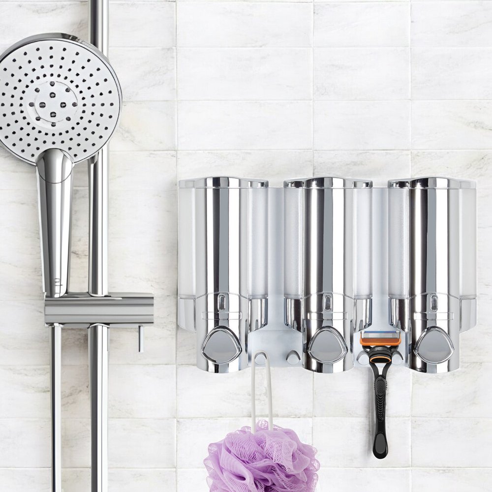 Add this aesthetically pleasing silver heavy duty plastic three chamber wall mount soap dispenser to your bathtub, shower, or sink area for a good looking and practical dispensing solution. Help to alleviate clutter and give your space a clean and cohesive look and feel. Holds a total capacity of 33 ounces spread between 3 individual compartments. Dispenses just the right amount of liquid each time, making this a potential money-saver as it cuts down on waste and allows you to buy bulk sized refill bottles of your product that are not only typically more cost effective, but are eco-friendly as well. 7-inch H x 11.25-inch W x 3.25-inch D