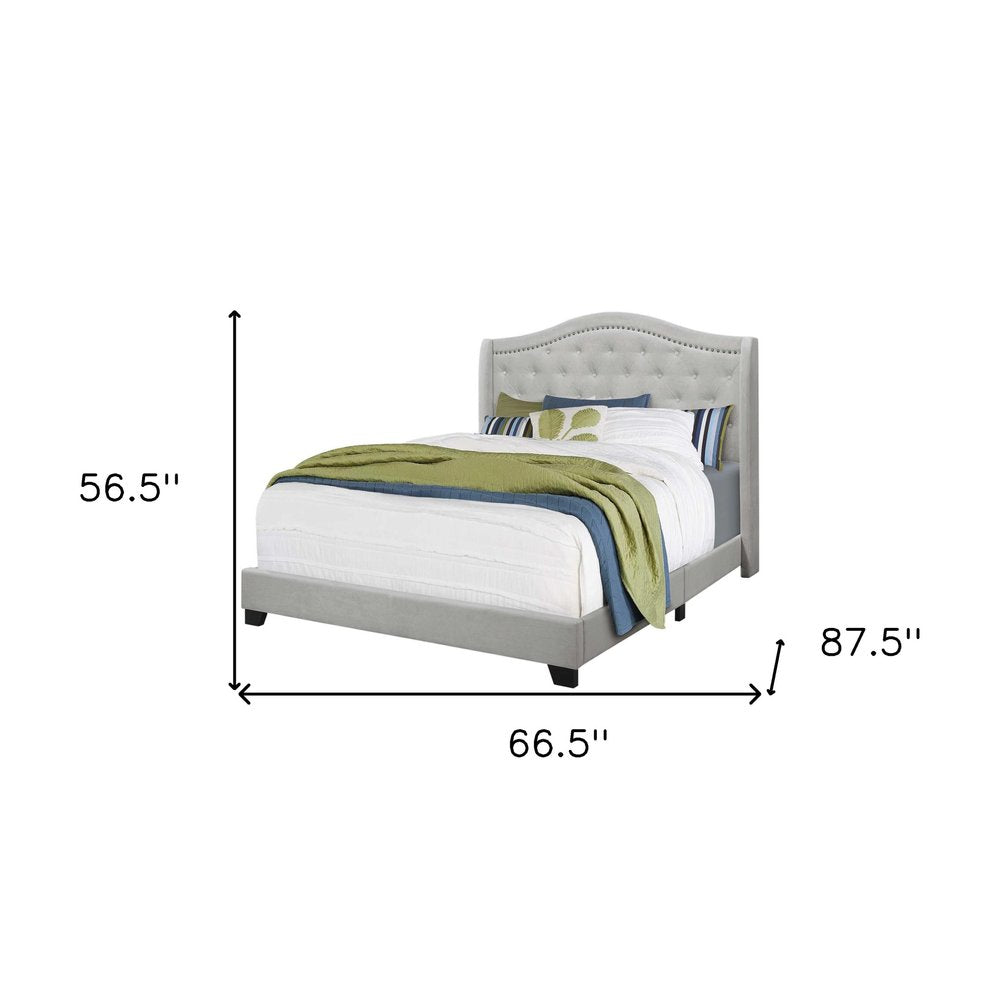 Update and anchor your room in style with the fabulous light gray and gray wood tufted upholstered queen bed frame with nailhead trim. This partially upholstered bed frame is covered in a beautiful button tufted gray 100% polyester that features nailhead trim to bring a unique and high end touch to your room. We spend so much time in our bedrooms, thus making quality craftsmanship and good looks vitally important. Built to last, this piece not only looks good but reflects premium workmanship from top to bottom. This bed will help to create a peaceful environment that will provide restful slumber for years to come. 56.5-inch h x 66.5-inch w x 87.5-inch d.