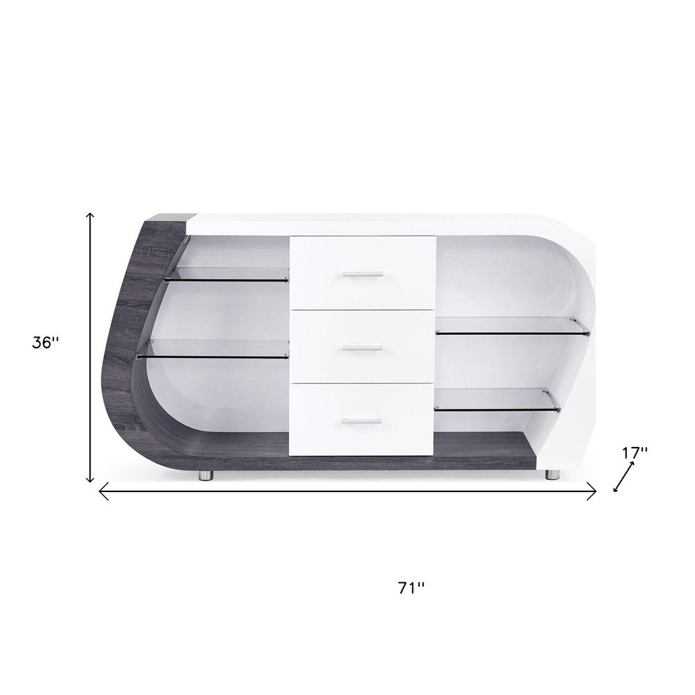Space constraints in your dining area? Then this versatile storage buffet is the solution to all your home decorating needs. Unusual It are the hallmark of this ultra-contemporary buffet, making it immediately the eye-catching focal point of your entertainment/dining area. Storage problems disappear thanks to this buffet's abundant shelf space and drawers. Incorporating solid woods and veneers in a multi-toned White and Grey, this buffet is an easy fit for many room decors and will add drama and sophistication to any room environment. Quality construction ensures durability and long lasting wear. This buffet is a smart choice for the discerning shopper and will give you the flexibility you need without sacrificing unique appeal.