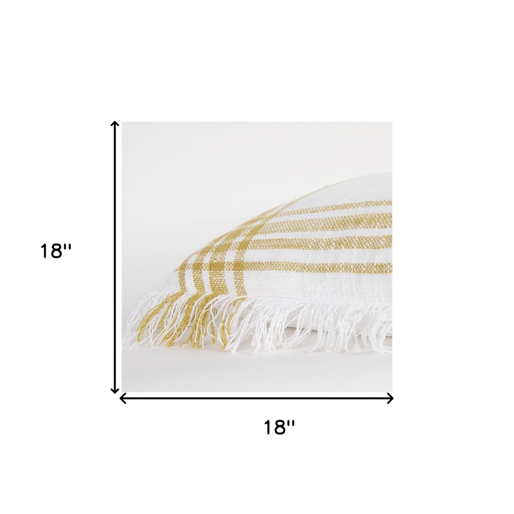 Bring a blissful bohemian aesthetic to your modern home with this White Gold Open Plaid Textured Throw Pillow that exudes a timeless traditional grace to pair well with any interior style. Crafted with care, the pillow is woven using white and gold cotton slub yarns to create an open plaid pattern that looks both simple and artisanal to allure the gaze. The pillow is both soft and durable, with a textured surface and self fringes that give the pillow a handcrafted visual appeal. The back of the pillow comes in a matching solid cotton fabric with a hidden zipper closure for ease of fill and cleaning. The polyfill insert ensures a fluffy look with a soft and cozy feel at the touch. Beautifully designed with a heathered appearance, this decorative pillow is a true representation of authenticity and simplicity tied together by modern minimalism. 18” x 18” x 6”