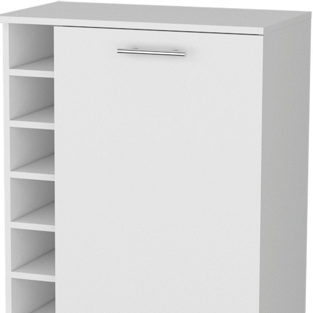 This white rolling bar cart with wine storage is a must-have for modern style enthusiasts. Crafted with a manufactured wood frame and top, this rectangular bar cart features cabinets for convenient storage. Its wheels make it easy to move the cart around, allowing you to serve your guests with ease. The white color adds a touch of elegance to any space while the wine storage section can hold up to six bottles, making it perfect for entertaining. Whether you're hosting a party or simply enjoying a glass of wine at home, this bar cart is the ultimate accessory. 32.3-inch H x 25.8-inch W x 14.7-inch D