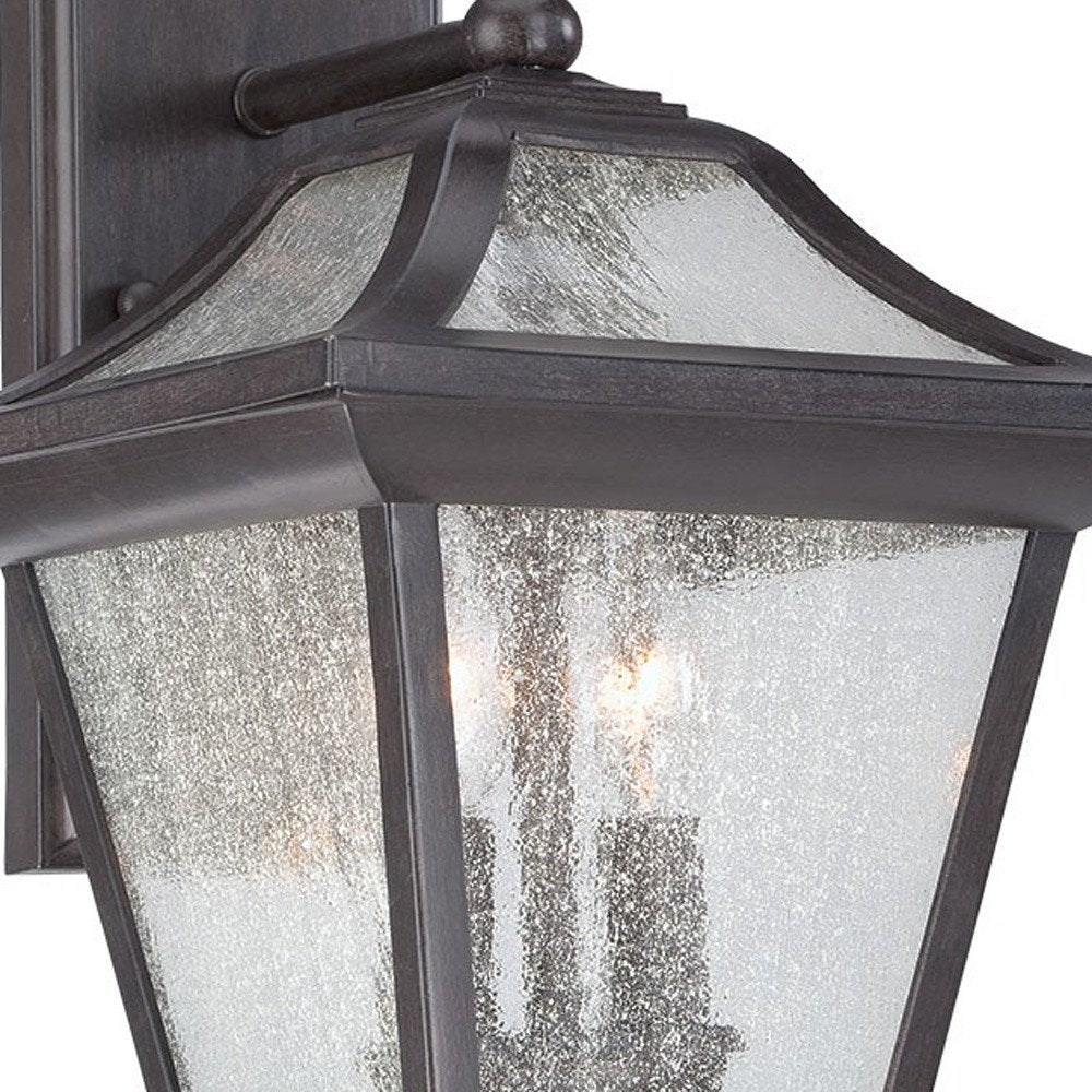 Bring in a combination of traditional and whimsical décor to the exterior walls of your home with this XL Matte Black Birdhouse Shape Outdoor Wall Light. The wall bracket has a rectangular shape and has one round cast aluminum rod attached to it. This rod holds the birdhouse shaped light up. The birdhouse has a sloping roof with a tapered body ending in a solid base. The roof and body have glass panels lining the frame. The clear waterfall effect glass with the matte black frame will bring in a lot of character to any space you use this light in. 12.63" H x 9" W x 10" D
